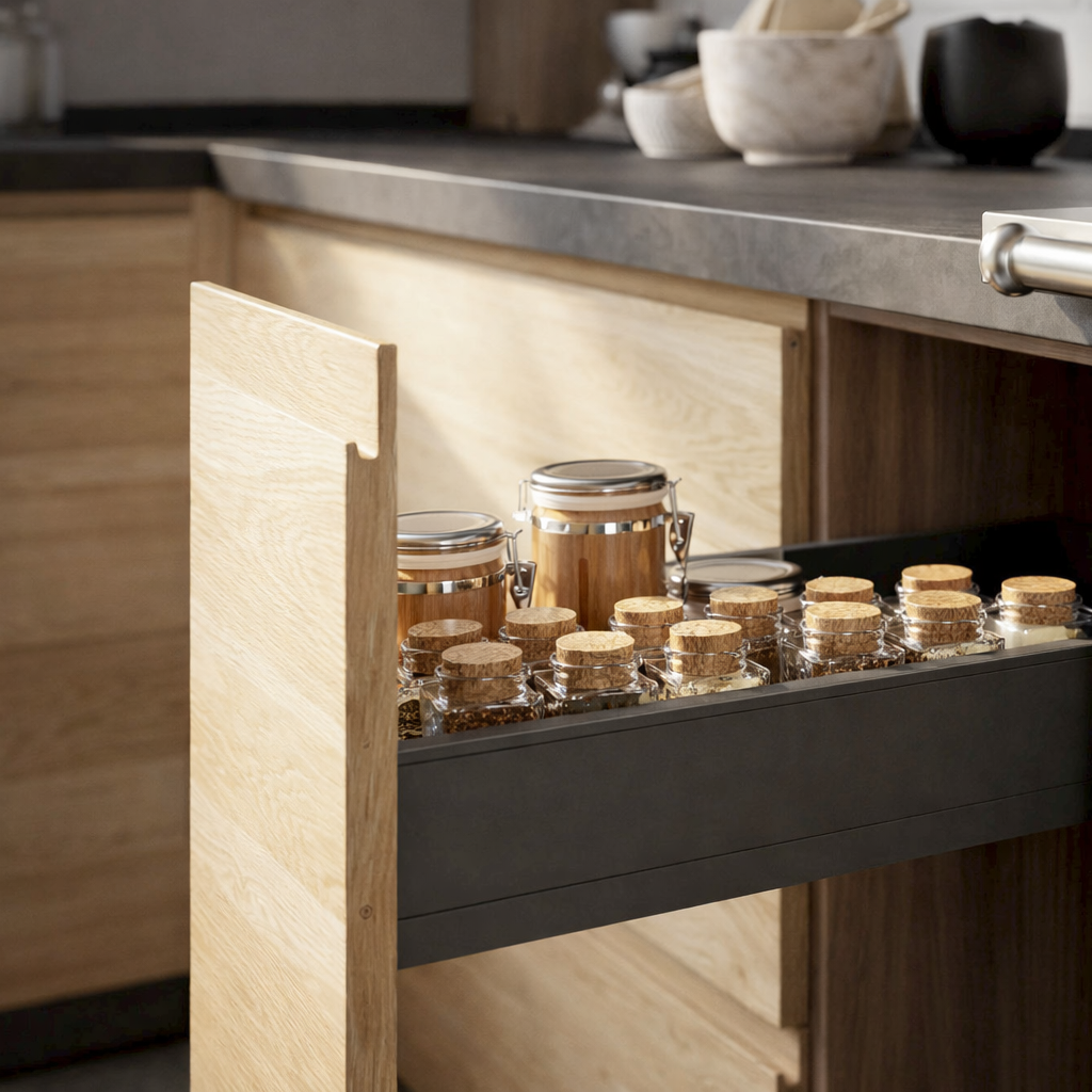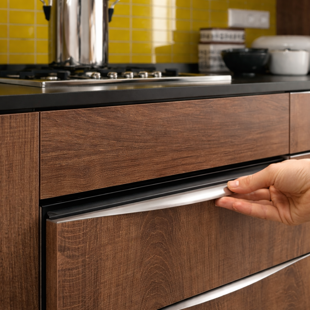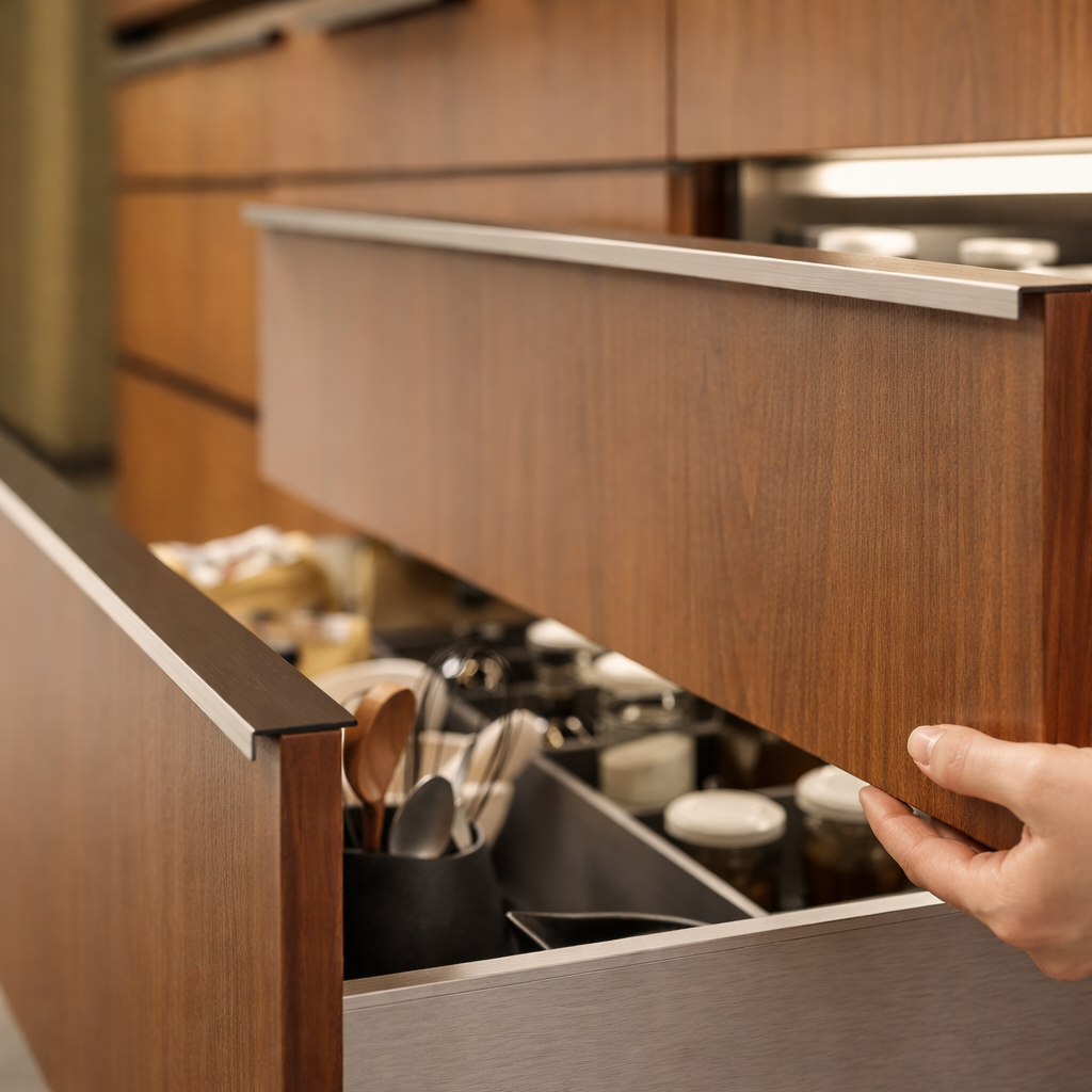 Potrivit pentru usi cu margini drepte, acest sistem fara maner permite un design minimalist si o linie uniformă a fronturilor.