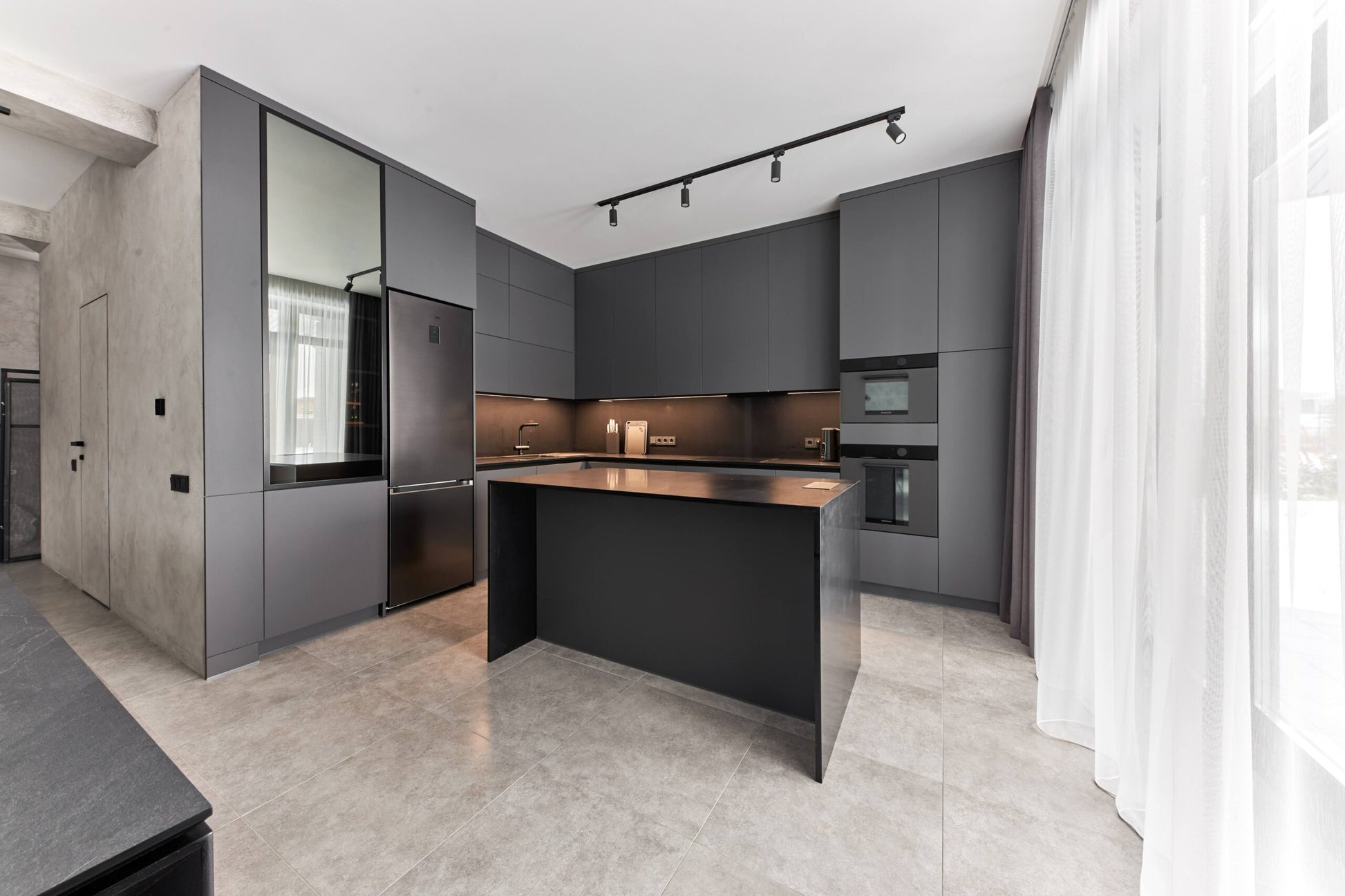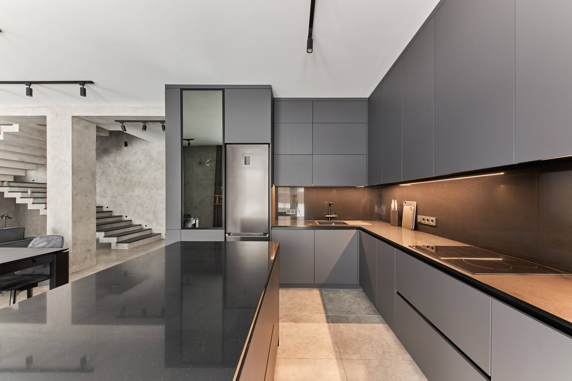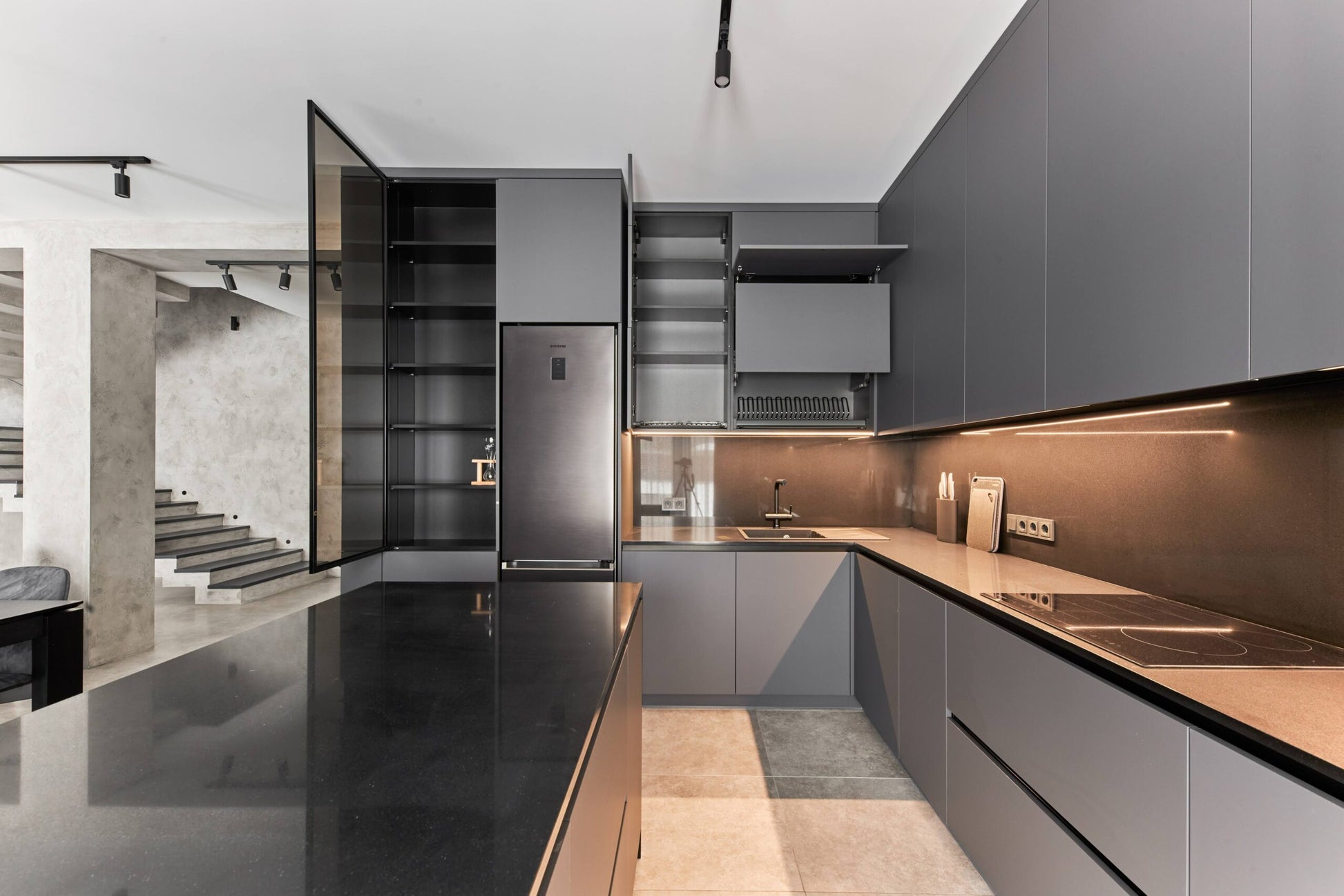 Conceputa intr-un stil modern minimalist, bucataria combina eleganta culorilor inchise. Designul sau simplu, dar sofisticat, se potriveste perfect locuintelor contemporane, unde estetica moderna se imbina cu confortul zilnic.