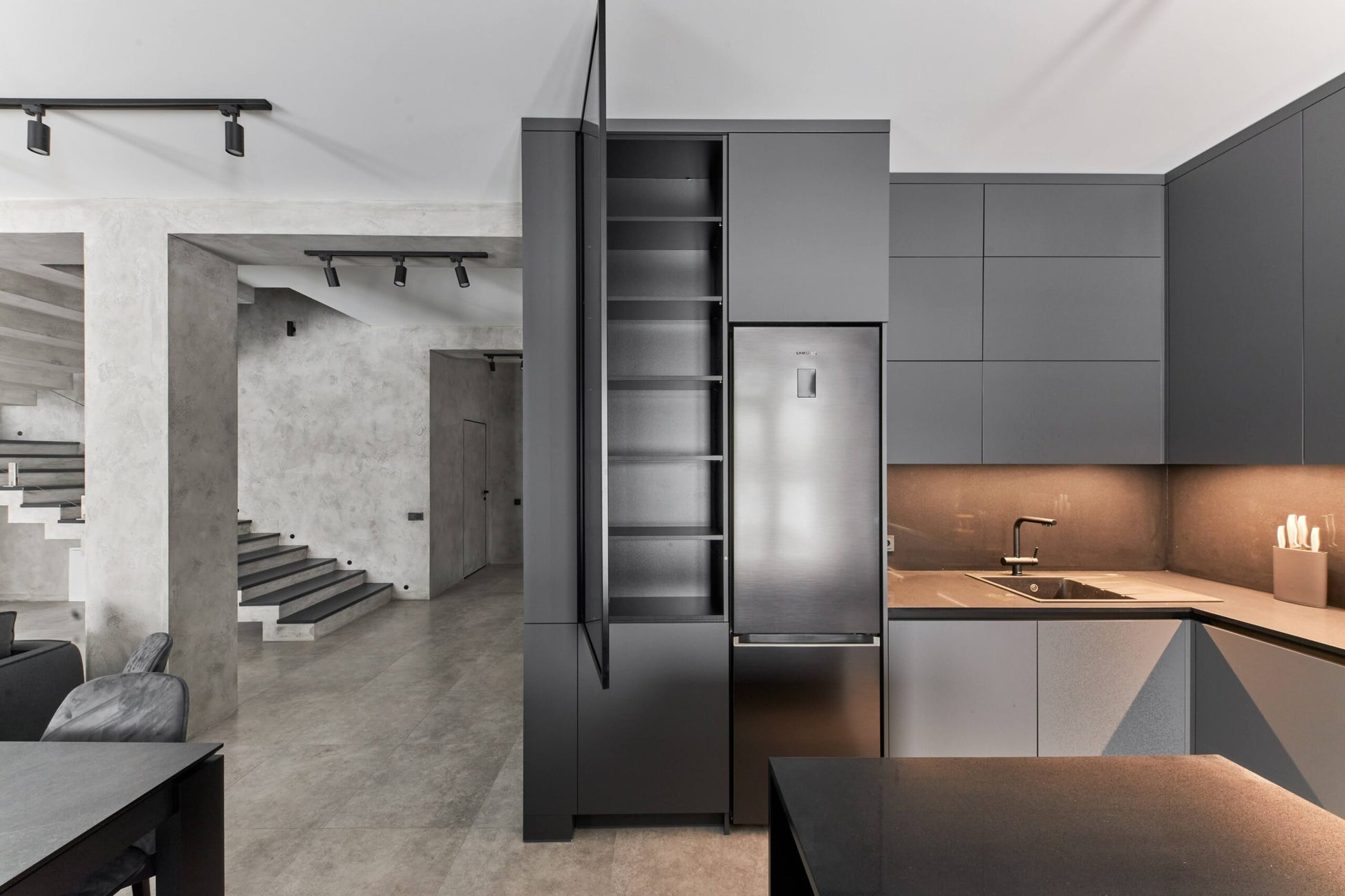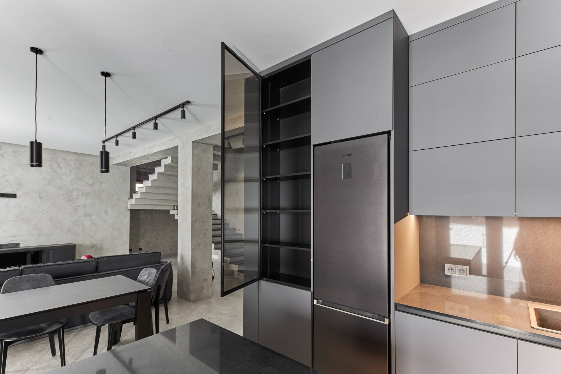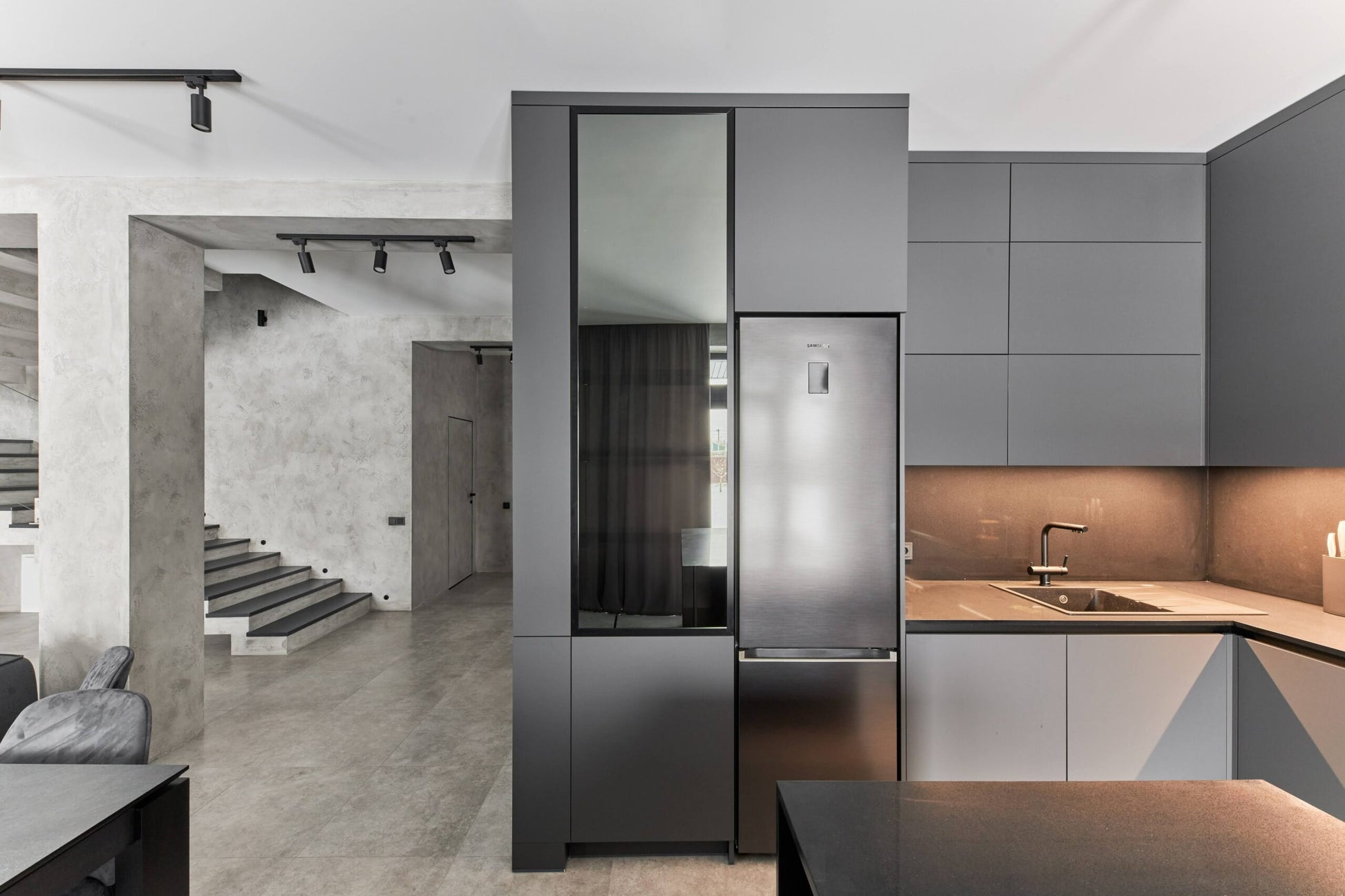 Conceputa intr-un stil modern minimalist, bucataria combina eleganta culorilor inchise. Designul sau simplu, dar sofisticat, se potriveste perfect locuintelor contemporane, unde estetica moderna se imbina cu confortul zilnic.