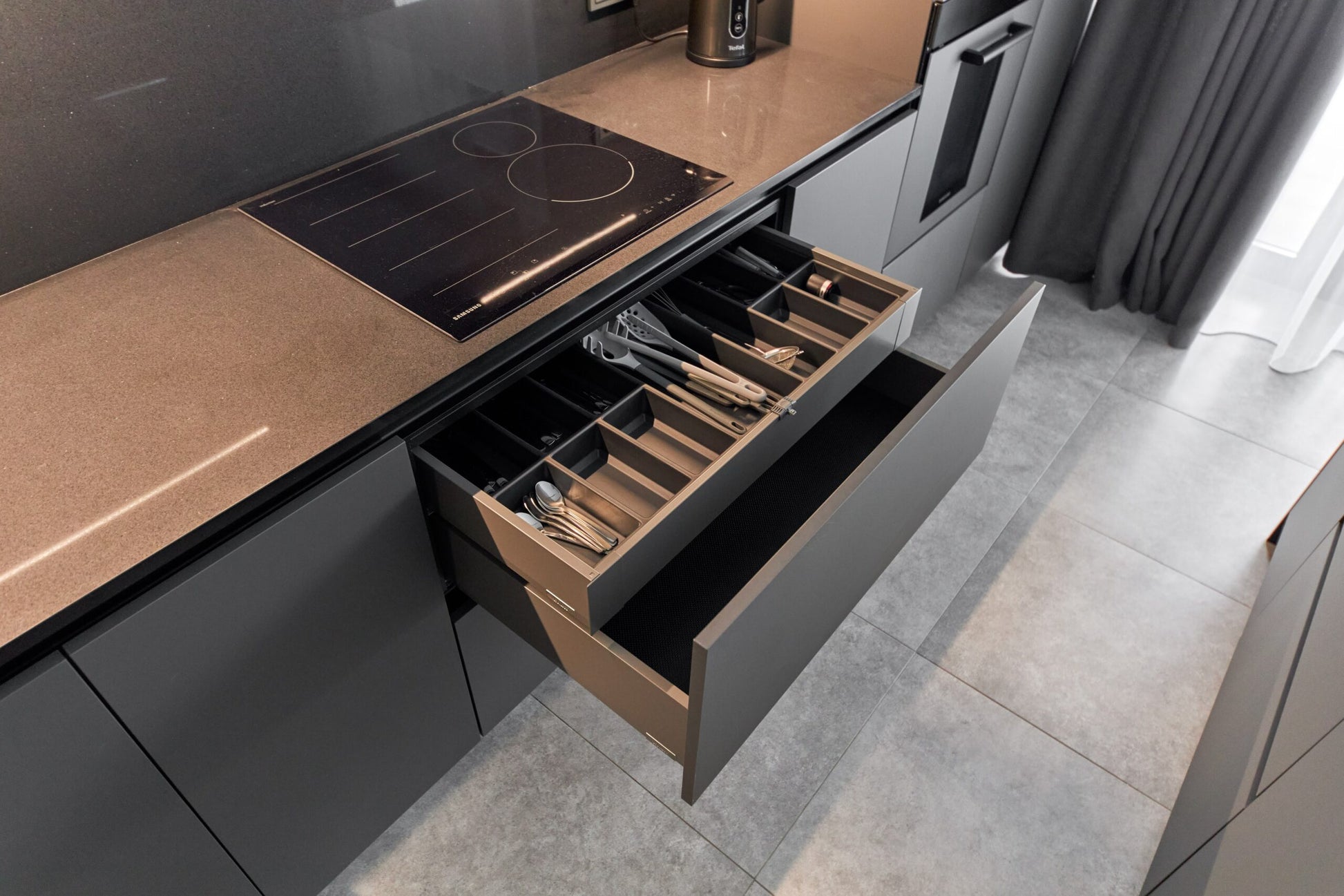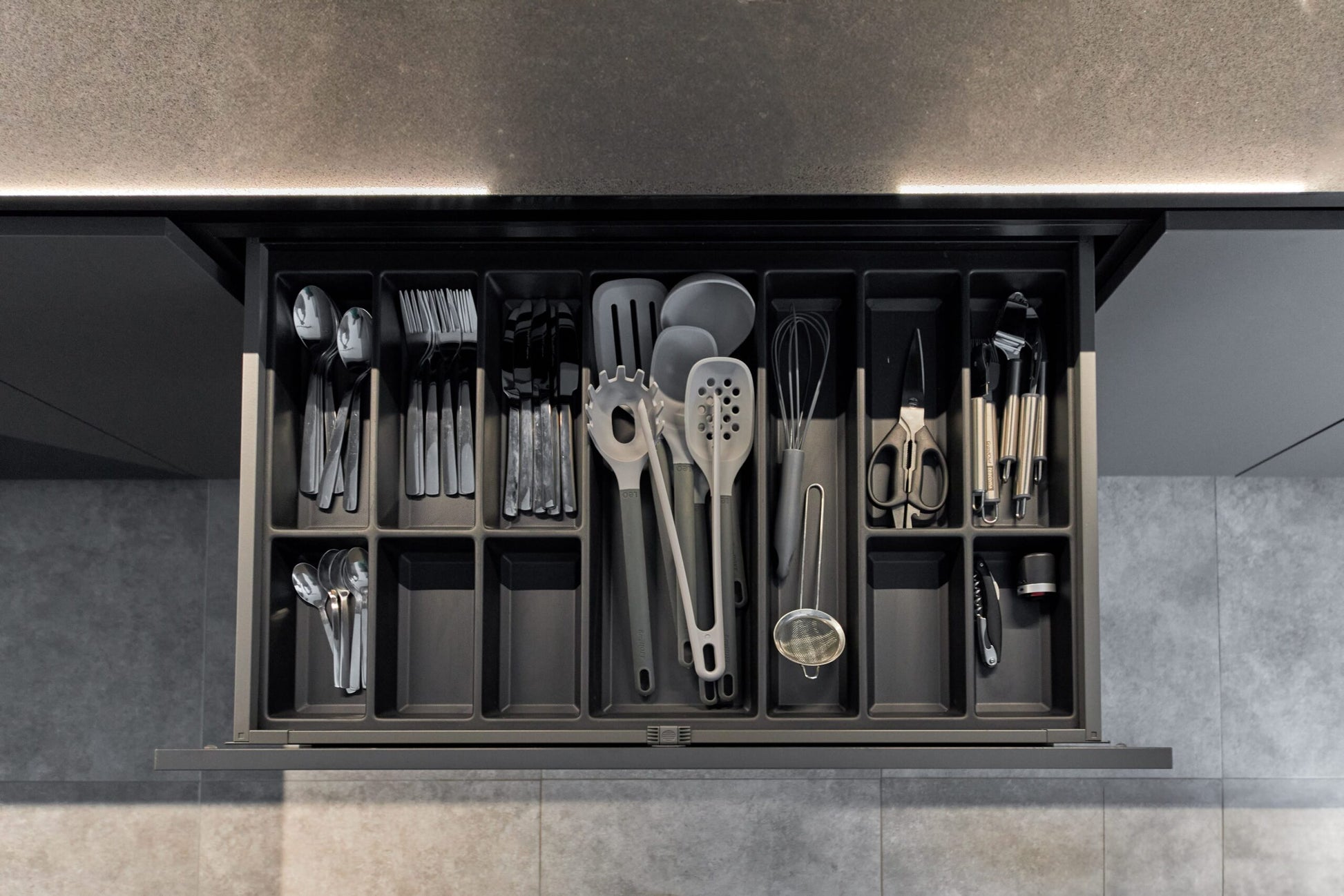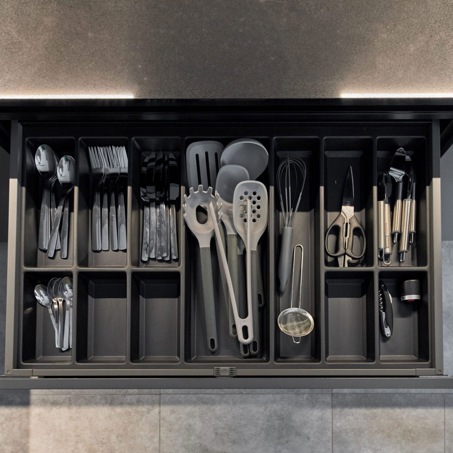 organizer modular pentru tacamuri si ustensile, realizat intr-o nuanta eleganta de gri antracit, in ton cu designul modern al mobilierului.
