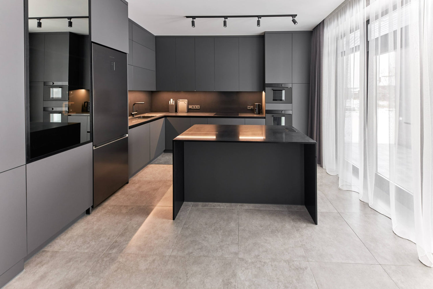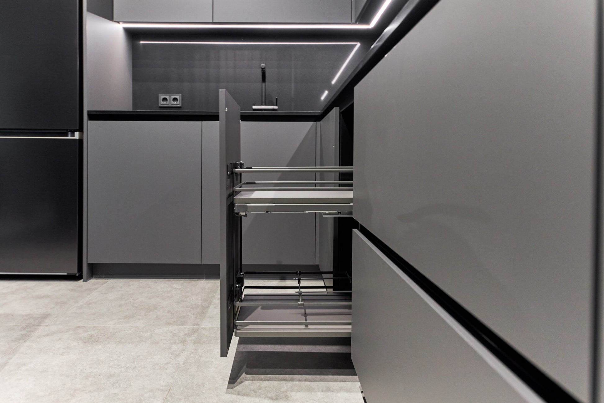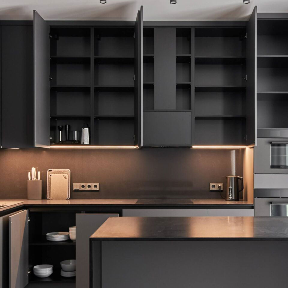 Liniile drepte, fronturile fara manere, corpuri inchise la culoare si finisajele mate definesc un aspect curat si ordonat. Spatiul este organizat ergonomic, oferind libertate de miscare si acces facil la fiecare zona de lucru.