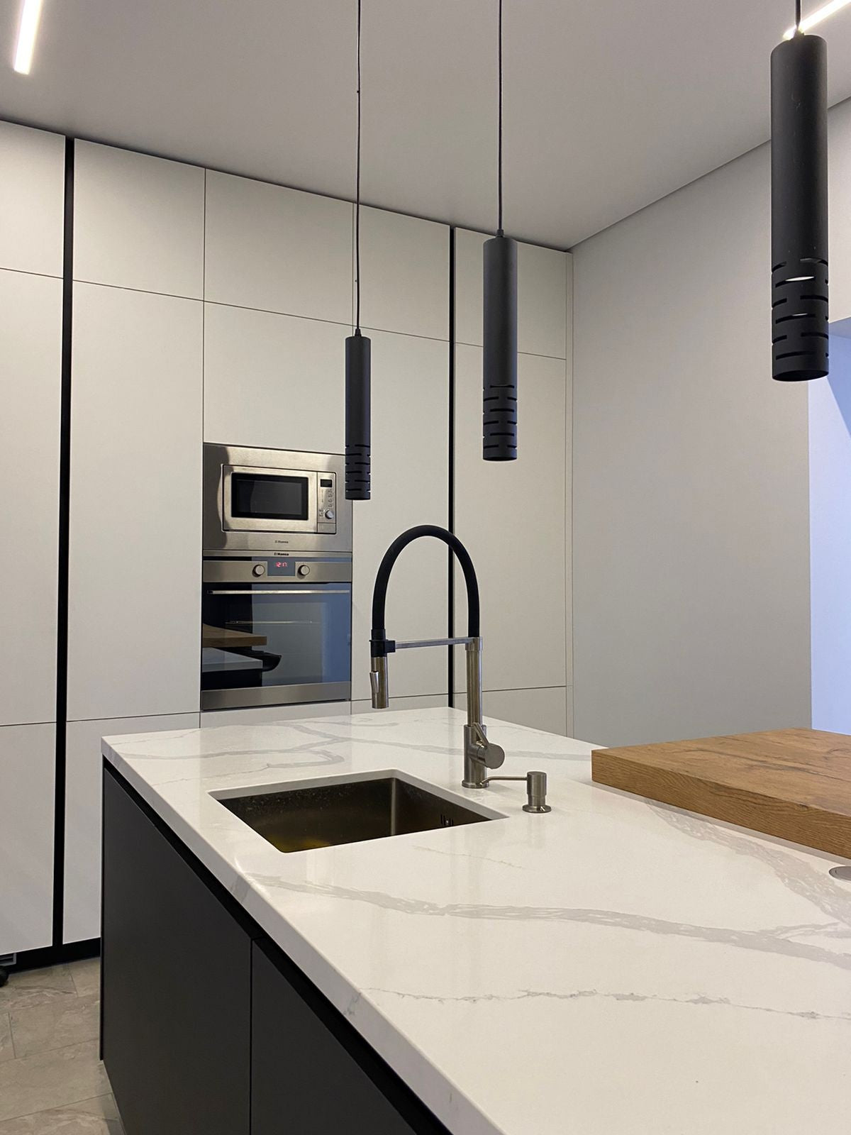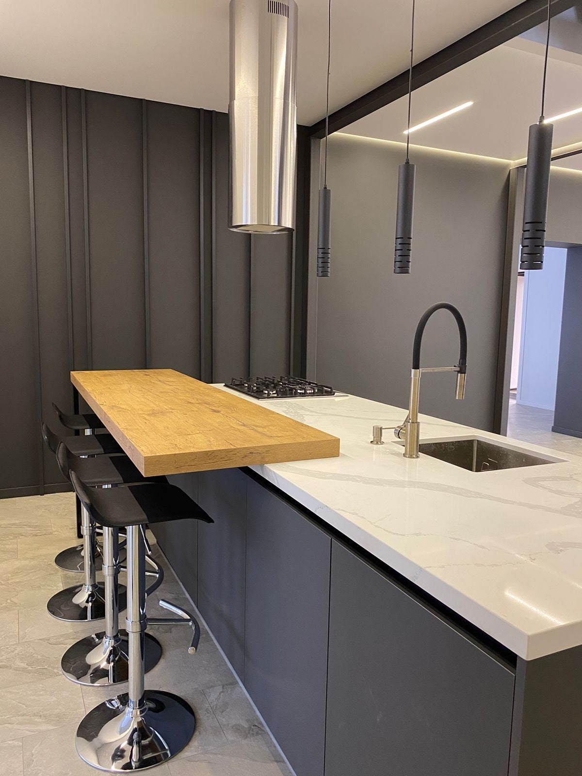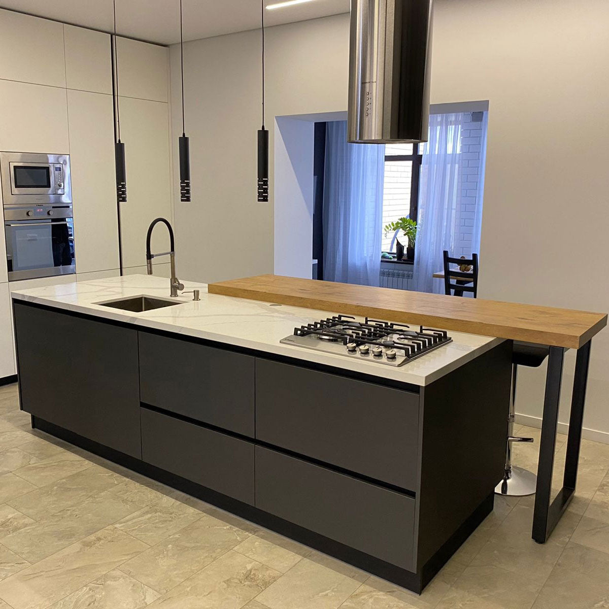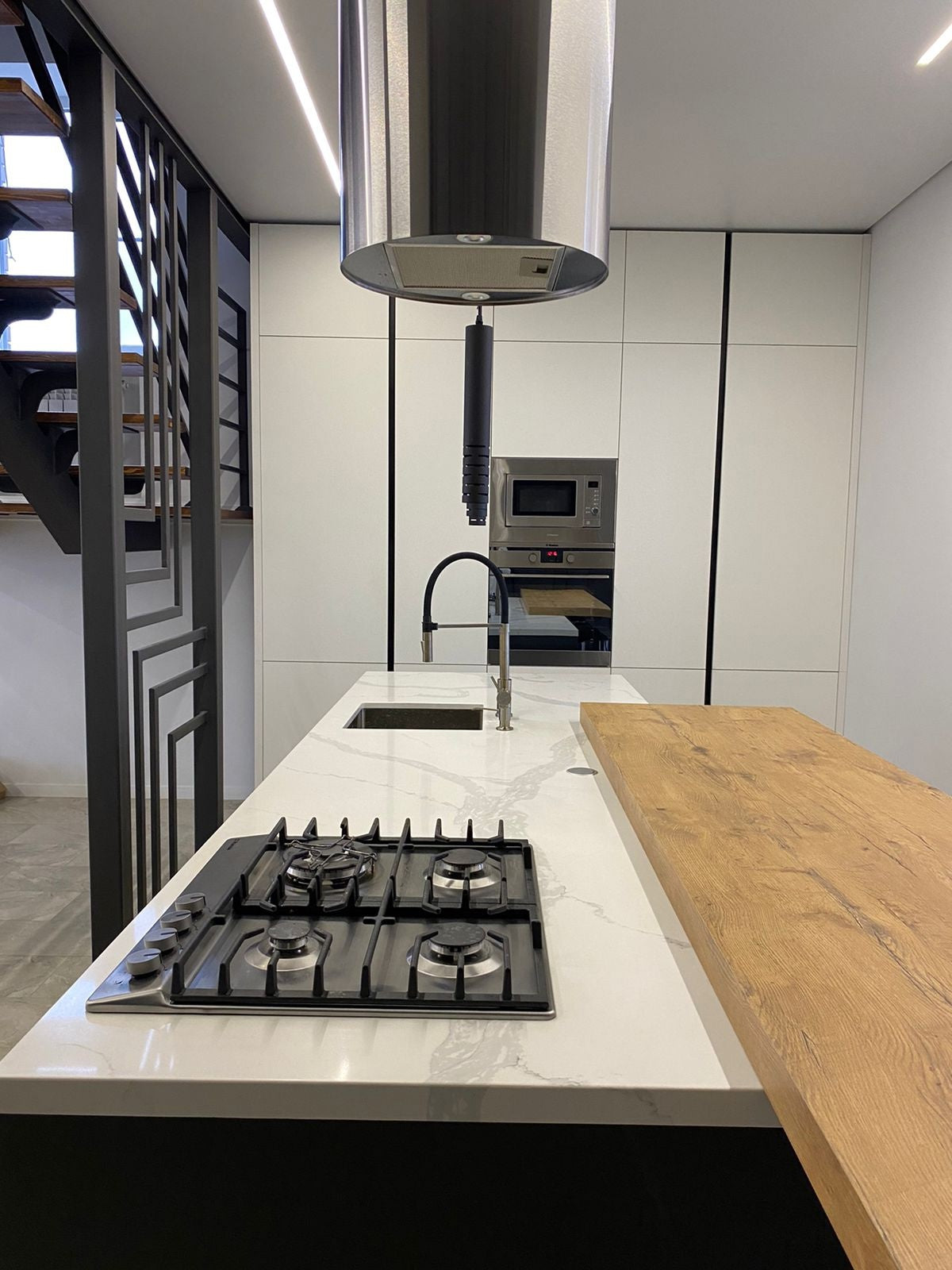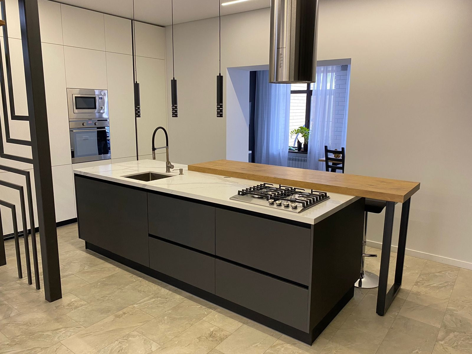 Bucatarie moderna cu insula, definita printr-un design minimalist si functional. Corpurile in finisaj mat negru contrasteaza elegant cu blatul alb, oferind un aspect sofisticat si echilibrat. Insula combina zona de gatit cu un blat din lemn cald, ideal pentru servirea micului dejun sau discutii relaxate. Electrocasnicele incorporate si corpurile fara manere pastreaza liniile curate, iar corpurile suspendate cu iluminare discreta accentueaza estetica contemporana a spatiului.