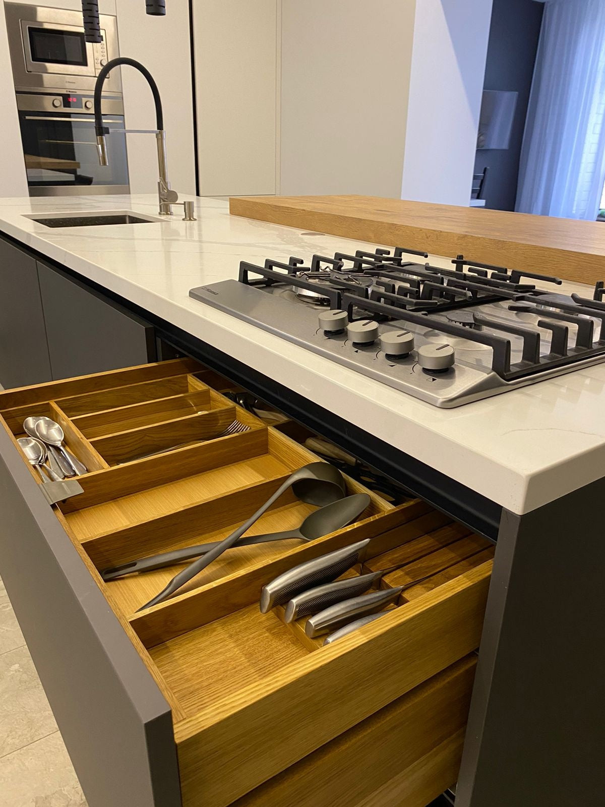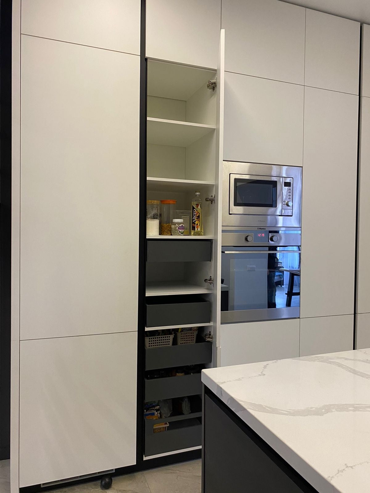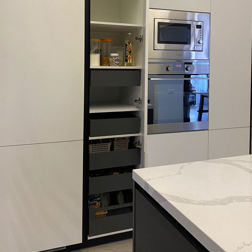 Penalul este conceput cu sertare interioare, oferind acces rapid si organizare eficienta pentru produse alimentare si ustensile. Designul ascuns pastreaza un aspect curat si minimalist, perfect integrat in linia bucatariei moderne.