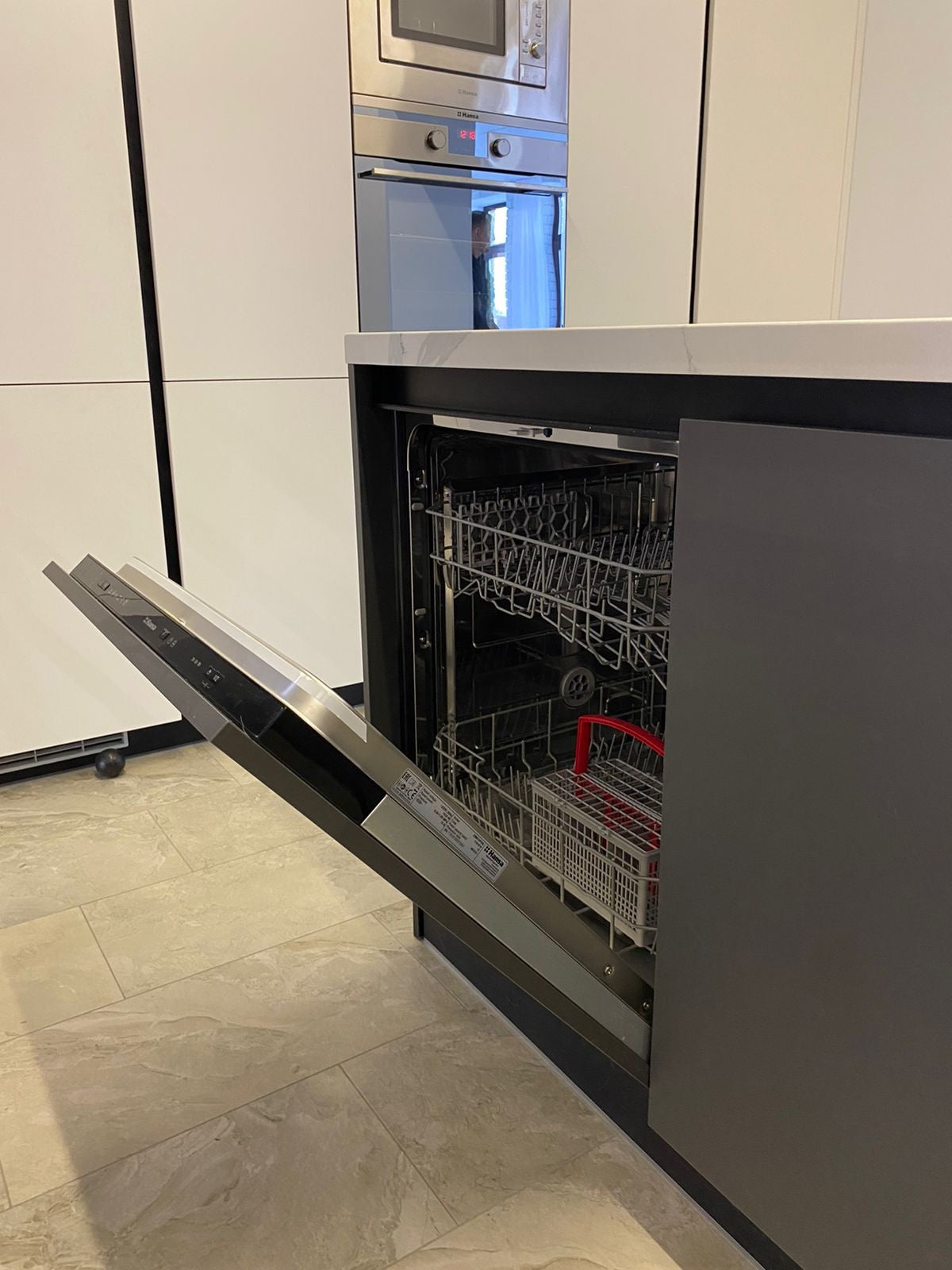 Electrocasnice integrate: cuptor cu microunde, plita, hota, frigider, masina de spalat vase