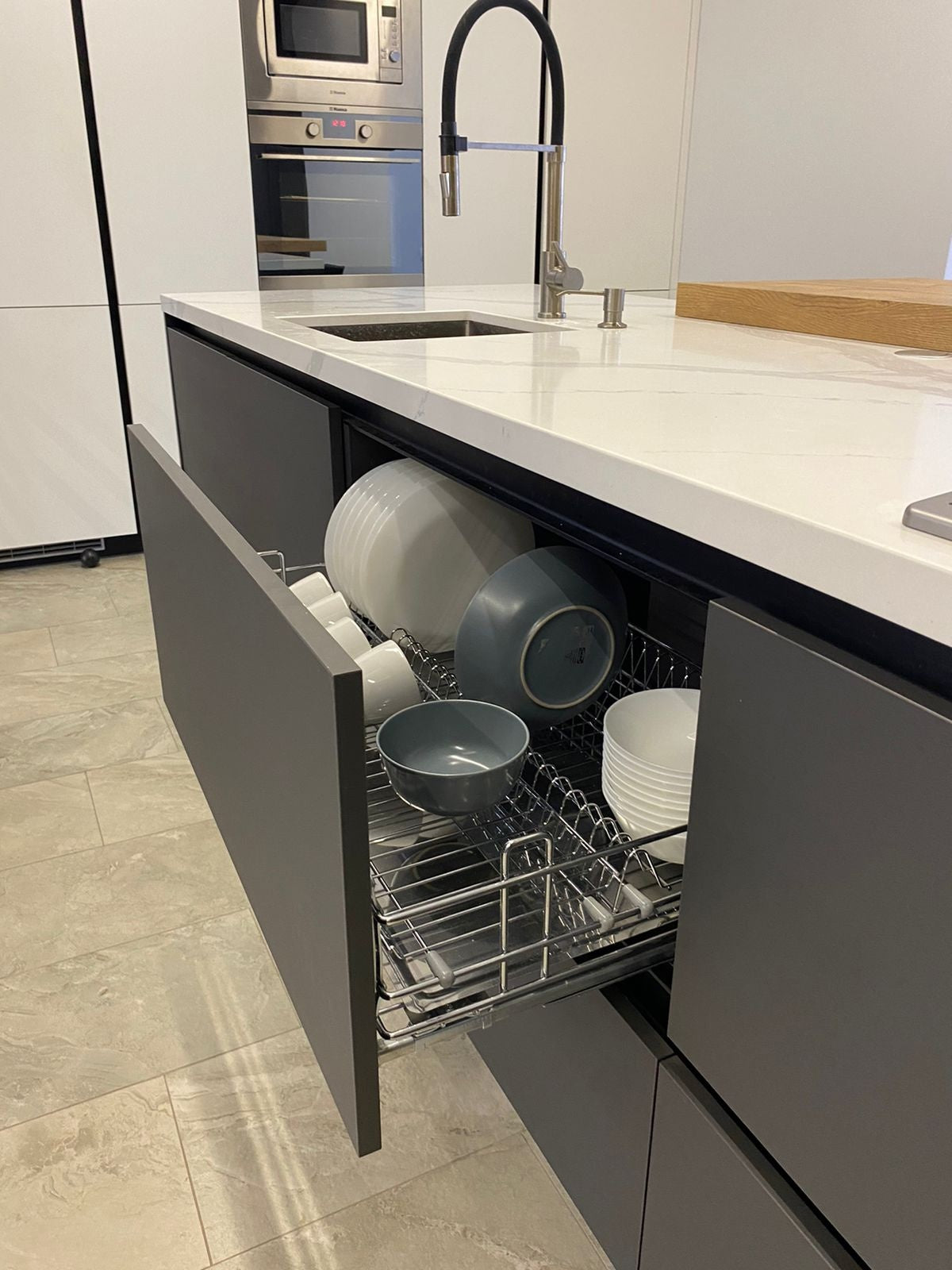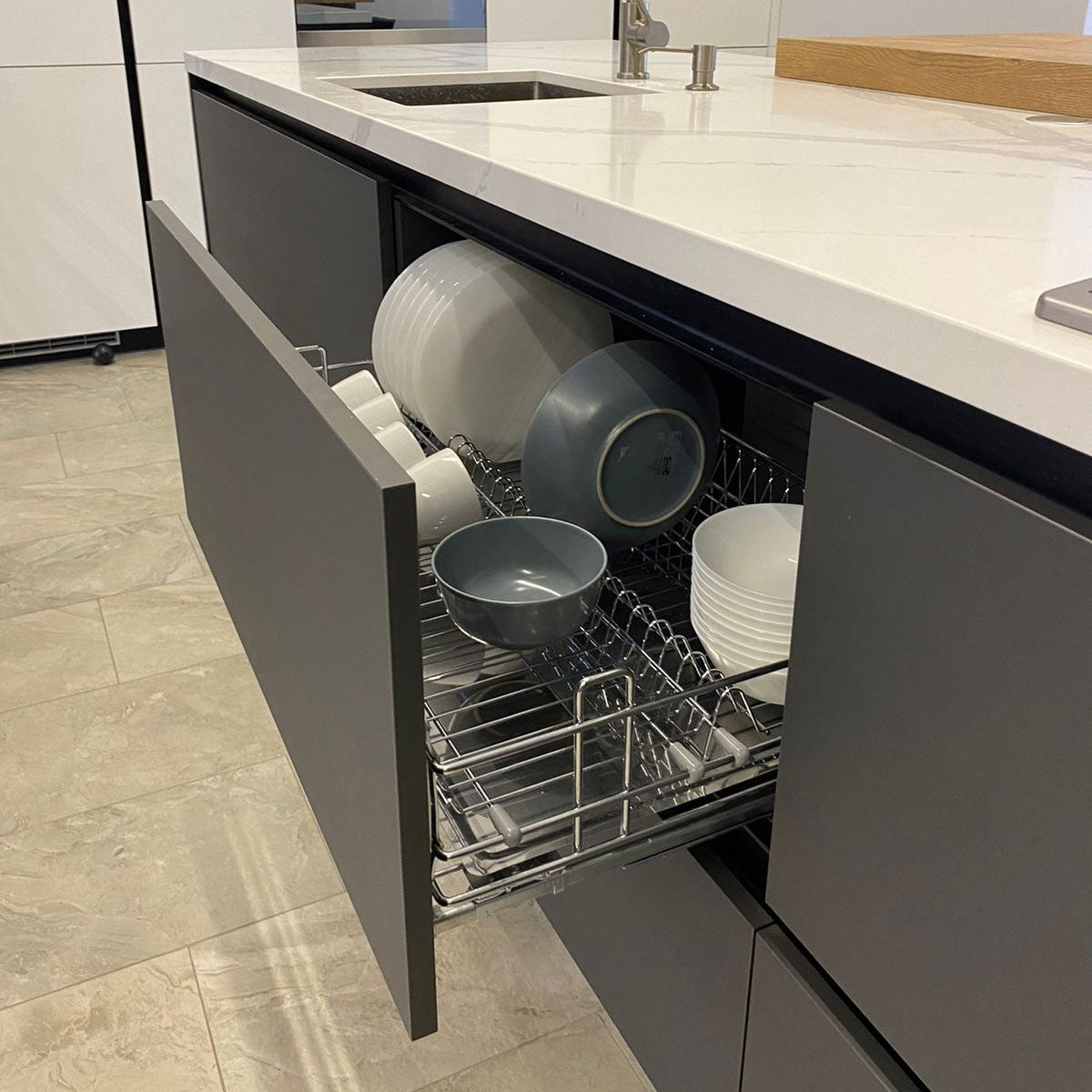 Uscator de vase integrat in sertar, o alternativa moderna si ergonomica fata de uscatoarele standard montate in corpurile suspendate. Pozitionarea sa la nivelul blatului permite acces rapid, elimina scurgerea apei pe mobilier si mentine un aspect curat.
