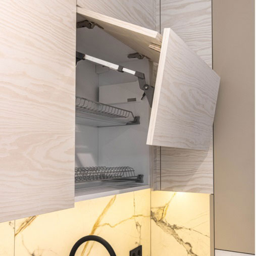 Sistemele Aventos pentru ridicarea fronturilor ofera acces facil la corpurile suspendate, combinand confortul cu designul modern. Mecanismele ascunse asigura o deschidere lina si silentioasa, ideale pentru bucatarii functionale si elegante.