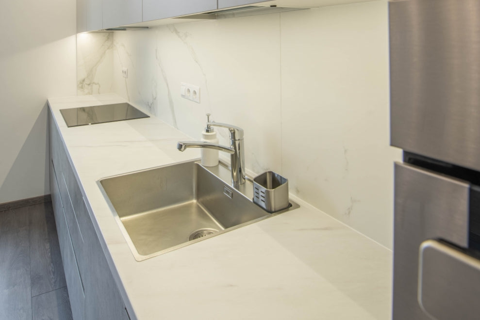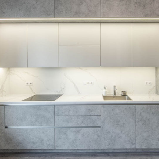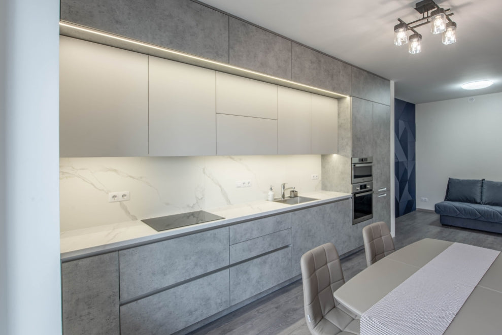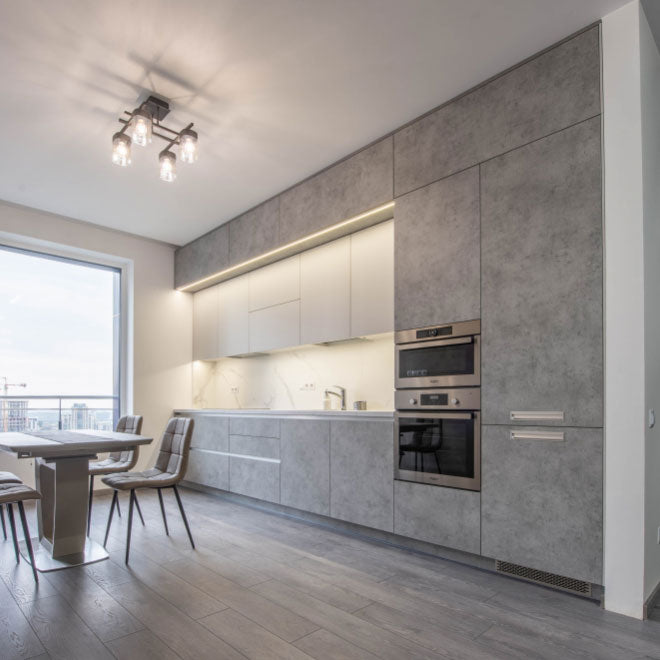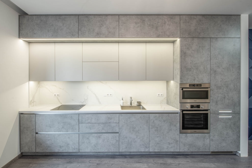 Bucatarie moderna cu antresol, definita printr-un design minimalist si tonuri de gri beton combinate cu alb mat. Blatul HPL si contrablatul din faianta, realizate in aceeasi nuanta, adauga un accent natural si o textura calda, in contrast cu suprafetele netede ale mobilierului. Iluminarea LED sub corpurile suspendate evidentiaza liniile curate ale designului, iar electrocasnicele incorporate completeaza aspectul ordonat si functional.