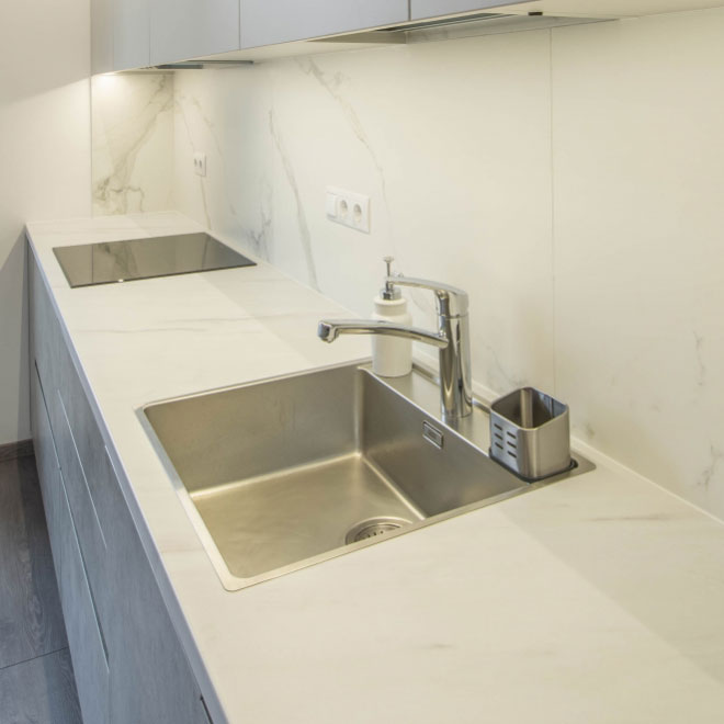 Faianta este extrem de rezistenta la caldura, umezeala si zgarieturi, fiind o alegere ideala pentru zona de lucru. In plus, suprafata neteda se curata usor si isi pastreaza aspectul impecabil in timp, fara a necesita ingrijire speciala.